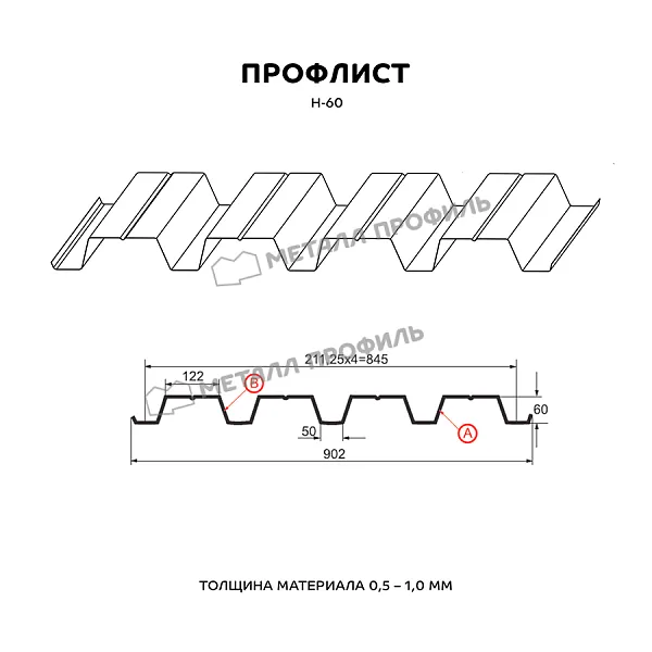 Профлист МЕТАЛЛ ПРОФИЛЬ Н-60x845-A (PURMAN-20-9010-0,5) часто используется для обустройства профилированного листа. Представляет собой металлический оцинкованный лист с покрытием. Толщина стальной основы с оцинковкой и декоративно-защитным покрытием составляет 0.5 мм. Проходя процедуру холодного проката, металл принимает волнообразный вид. Такая форма придает профилю несущую способность.