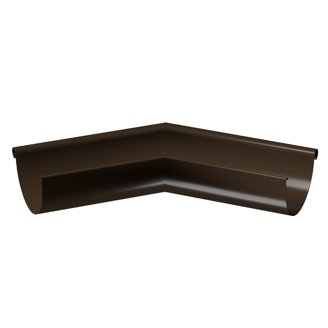Металлический внешний угол желоба 135˚ «Stal Premium» может быть коричневого оттенка «Каштан» или еще одного из трех цветов на выбор. Служит для герметичного и прочного соединения двух желобов на внешних углах строения.